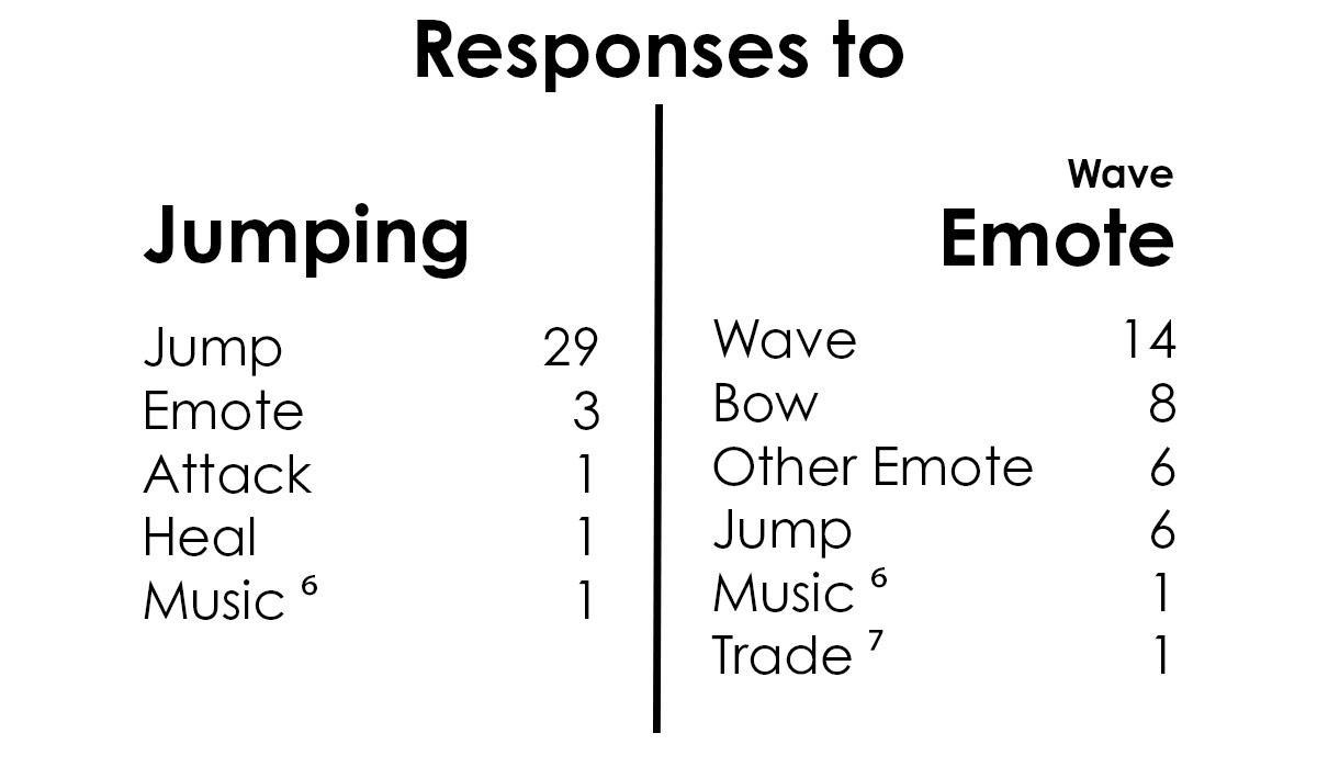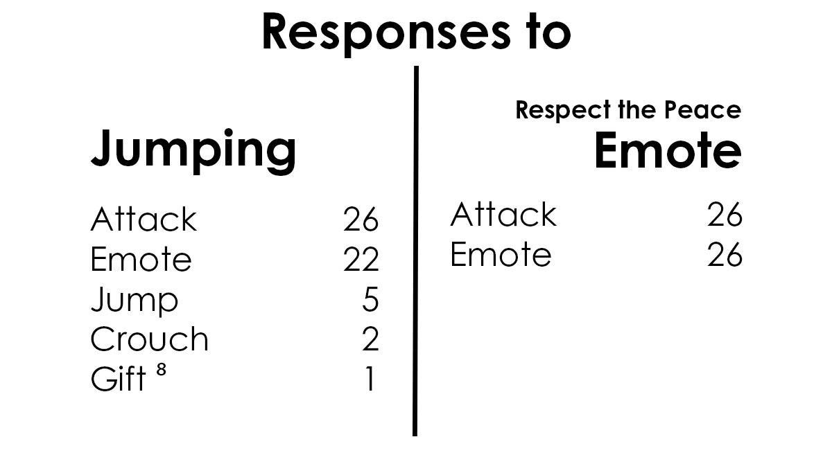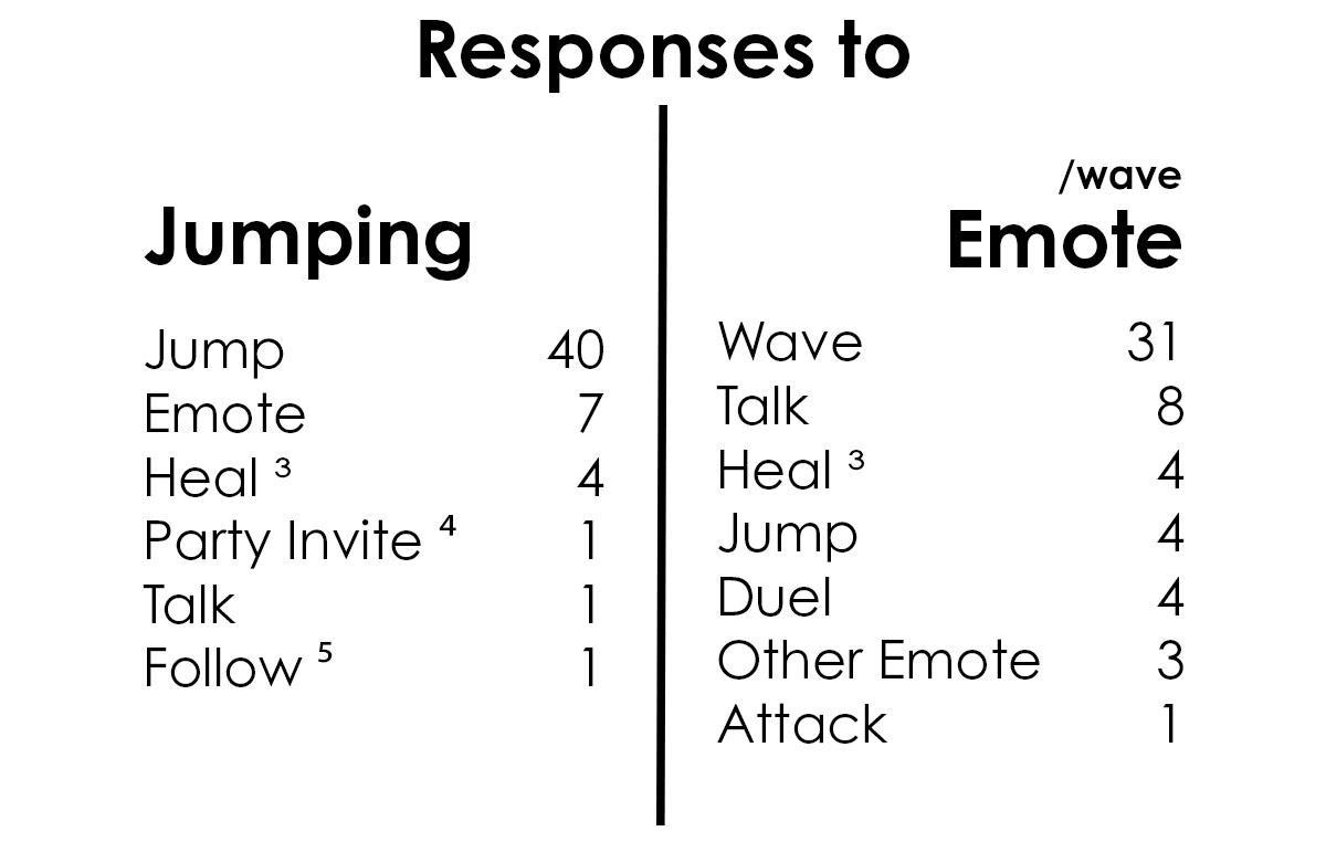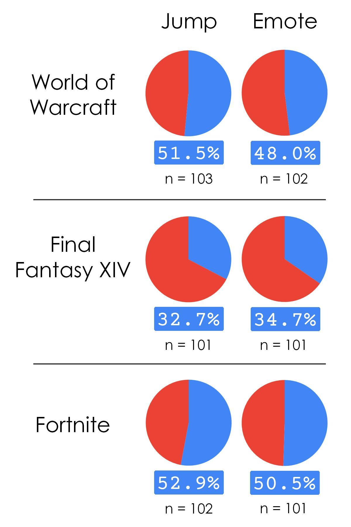 The most noticeable trend shown here is that, while the proportion of responses received varied between games, the number of responses to jumping is equal to the number of responses to emotes (α = 0.05). In other words, for both World of Warcraft and Fortnite, whether I made my avatar jump or perform an emote, around half of the players responded to me. For Final Fantasy XIV, in both surveys, I received responses from around a third of the players.